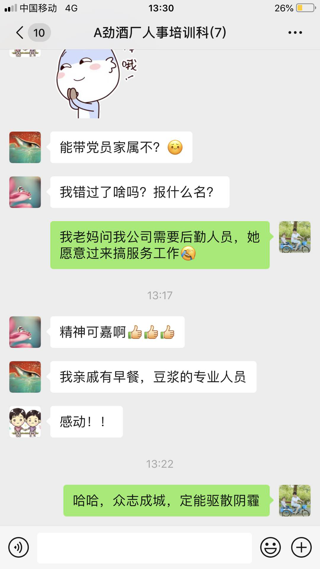 第一批報(bào)名時(shí),很多同事因?yàn)闆]有及時(shí)看到信息,報(bào)名晚了還表示遺憾。在報(bào)名結(jié)束后仍有同事不斷向劉暢打來電話或發(fā)來微信要求報(bào)名。整個(gè)下午,她的電話成了熱線電話,個(gè)人微信被報(bào)名信息刷屏。