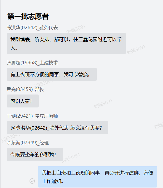 “我有車,住公司的我可以順帶”、“我車有空座,我來接你”、“住三鑫花園附近的可以帶人”“今晚要坐車的私聊我”……大家紛紛告知自己的地址、行車路徑,方便沒車的志愿者拼車乘坐。